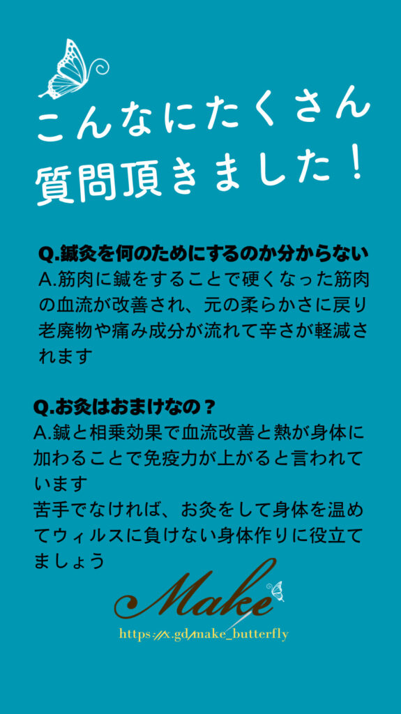 2026年1月12日 / 最終更新日時 : 2026年1月12日 m.tnk ブログ ~Makeからあなたへ~ 鍼灸ぎもん❓ 施術受ける前に不安や心配事あったら何でも施術スタッフに聞いてみましょうね♡ コメントを残す コメントをキャンセルメールアドレスが公開されることはありません。 ※ が付いている欄は必須項目ですコメント ※ 名前 ※ メール ※ サイト 次回のコメントで使用するためブラウザーに自分の名前、メールアドレス、サイトを保存する。