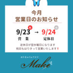2025年9月4日 / 最終更新日時 : 2025年9月4日 m.tnk お知らせ 9月の祝日営業について Makeの基本営業日は、土日祝日含めてですので 今月第4火曜の秋分の日も張り切ってOpenしております! 新学期も始まりバタバタと忙しく暑さにお疲れになったら お立ち寄りくださいませ ※定休日が翌水曜日に変更となります